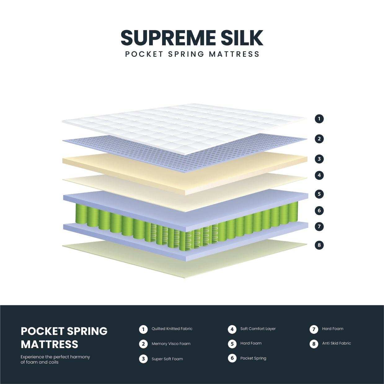 The Supreme Silk Pocket Spring Mattress combines luxurious comfort and advanced support, crafted with high-quality memory visco foam, super-soft foam layers, and a quilted knitted fabric surface. Its individually adjusting pocket coil system ensures perfect contour adaptation, offering balanced comfort and stability across every inch.